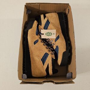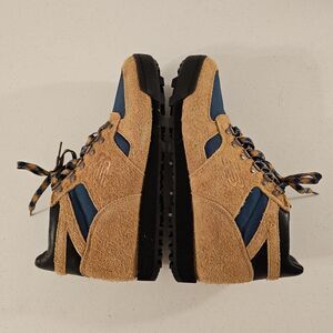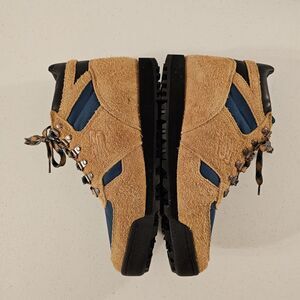 Nice Gorp New Balance 'Rainier' Lace-Up Boots, Beige Suede, Blue Fabric Details, Round Toe, Lace-Up Closure, Logo Tab Label, Side Imprinted Logo, Black Vibram® Rubber Sole. Retail $149