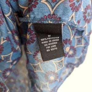 Cute geometric print top that you can wear all year long. Beautiful blue color with cute geometric pattern. Tie front neckline that can hang down, or tie in a bow. Adorable front buttons. 3/4 length sleeves. Semi-sheer fabric for a flattering, flowy look. IN PEFECT CONDITION! A MUST HAVE!