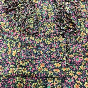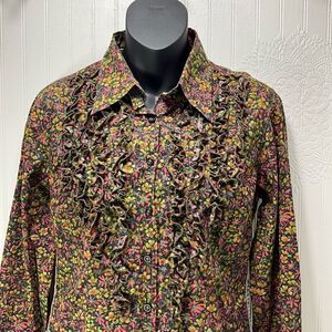 Women’s GEORG Roth Los Angeles long sleeve ruffle front button down floral shirt with velvet side trim. EUC, Size XS