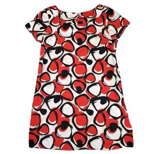 THIS GEORGE RETRO 60'S COTTON A-LINE DRESS IS JUST TOO CUTE! IT'S RED,WHITE, TAUPE & BLACK GEOMETRIC CIRCLE DESIGN MINI DRESS HAS A BUTTON NECK CLOSURE.