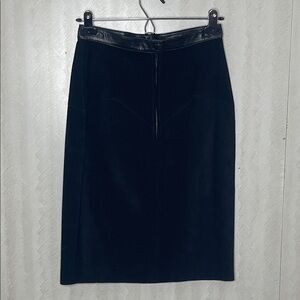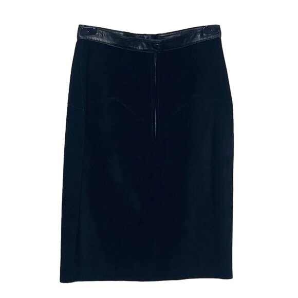 This sophisticated black skirt features a sleek leather trim, perfect for any occasion. Its classic design offers a timeless look.