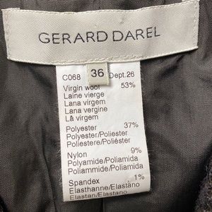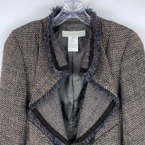 Super cute! Gerard Darel blazer. Brown tweedy fabric with fringe trim. 2 snaps in front for extra secure closure. Attached tie belt in front. Great pre-owned condition.
