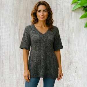 This grey cable-knit sweater dress is the ultimate blend of style and comfort! The long, form-fitting sweater can double as a trendy mini-dress, allowing you to effortlessly showcase your figure. With its short sleeves and V-neck design, it offers a perfect balance of cozy warmth and fashion-forward flair. Stay snug and stylish all season long with this must-have wardrobe staple.