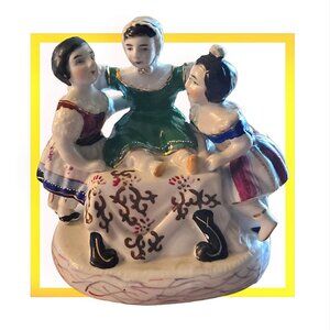 5 1/2" (14 cm.) (Missing base pan) The vignette depicts a little bonneted girl seated on a cushion, her hand resting on the heads of her two friends. The lid removes to reveal the hidden inkwells inside.