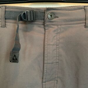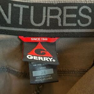 Gerry Venture" cargo shorts in a taupe color. These shorts are made from a stretchy, quick-drying fabric and feature an adjustable built-in belt, a button closure with a zip fly, and multiple pockets, including a side cargo pocket. The shorts have a relaxed fit and are designed for outdoor and indoor activities. The material is a blend of 96% nylon and 4% spandex.