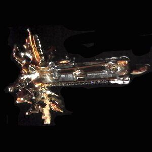 The yellow & red flame melts the enamel wax, it runs down the silver-tone Christmas candle. Green & gold sprigs of holly with a red berry adorn the base of the 2-1/4" long candle. The candle flame has a very small chip at the tip & on the left side of the flame which look like gold highlights to the eye. The photo microscope makes the chips appear worse. Gerry's was founded by Geraldine Giles in 1950 & dissolved in 1996. Pieces have listed for $100.