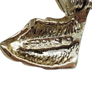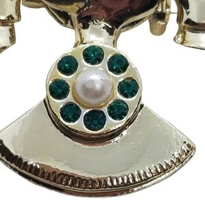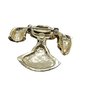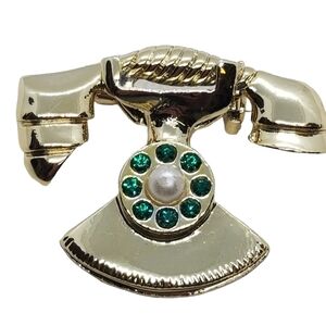 Lovely little vintage phone pin by Gerrys. Pin is goldtoned in color with emerald green rhinestone and faux pearl detail. Pin measures 1-1/4 inch tall abs 1-1/2 inch wide. Piece is stamped Gerrys on the back and is in excellent condition.