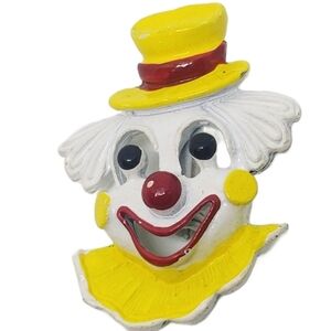 Fun vintage brooch/pin by Gerry's. Brooch is white with red and yellow enamel detail and depicts a whimsical clown. Brooch measures 1-5/8 inches tall and 1-1/4 inches wide. Brooch is stamped Gerrys on the back and in great condition.