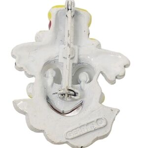 Fun vintage brooch/pin by Gerry's. Brooch is white with red and yellow enamel detail and depicts a whimsical clown. Brooch measures 1-5/8 inches tall and 1-1/4 inches wide. Brooch is stamped Gerrys on the back and in great condition.