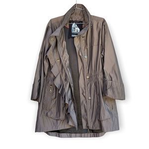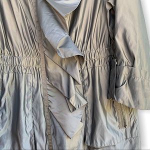 Snap closure with zipper underneath. Stow-away hood rolled up into collar. Cascading ruffle placket.