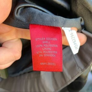 Flattering elasticized front waist. Zipper hand pockets. Fully lined.