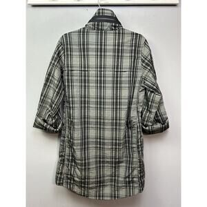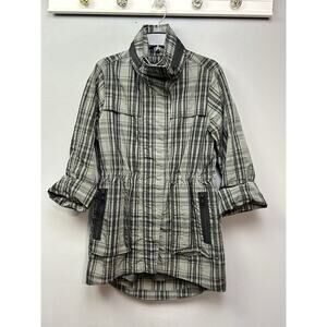 G.E.T. Plaid Utility Jacket Womens Small Green Packable Hood Roll Tab Sleeve