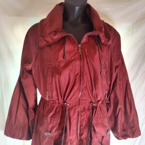 Beautiful athleisure jacket in a size large with gunmetal hardware and iridescent red/brown/ black fabric. Perfect for fall/winter (wear layers in winter). Zip closure, plenty of pockets, and adorable little para cord pulls to ruffle the fabric just so for a more feminine look. Stops above the knees, puff sleeves with elastic cuff and so much more. This jacket has runway style 😍. Order it today 🙂❤️👍