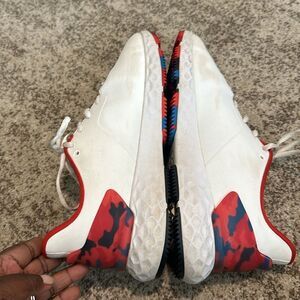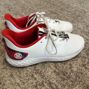 The perfect combination of lightweight comfort and technical performance, G/FORE Camo Accent MG4+ Golf Shoes feature a washable triple-density foam cushion footbed and an auxetic lattice midsole for unparalleled comfort, rebound, and cushioning. The MG4+ is paired with a fully waterproof, high abrasion-resistant exterior and a 3D molded external heel cup for added support. G/FORE Camo Accent MG4+ Golf Shoes Feature: Premium performance waterproof upper Washable and removable anti-microbial triple-density foam cushion footbed with massaging nubs for supreme comfort Fully padded mesh interior lining for breathability and comfort 3D Molded external heel cup provides stability Responsive auxetic lattice midsole and sidewall for all-day comfort 2 Piece rubber non-slip outsole with hybrid knurled and sawtooth traction pattern 98% TPU • 2% Polyester Style Number: G4MA23EF27 Poppy Fits Similar To Gallivanter, But With A Wider Toe Box; If You Are Between Sizes, Suggest Ordering Up VGUC has minor light scuffs on sides.