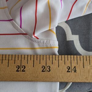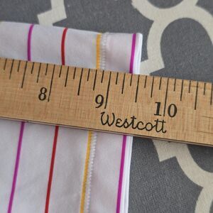 Color: White base with thin multicolor vertical stripes in red, yellow, and purple.