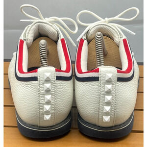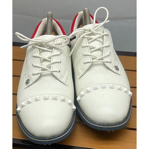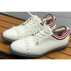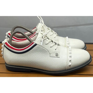Stylish G/FORE athletic shoes. White leather with red and black accents. Perfect for sports and casual wear.