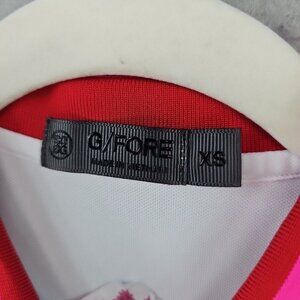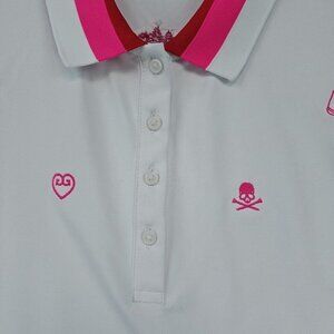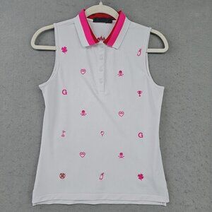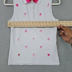 Stylish white tank top. Features pink collar and playful pink icons. Perfect for casual wear.