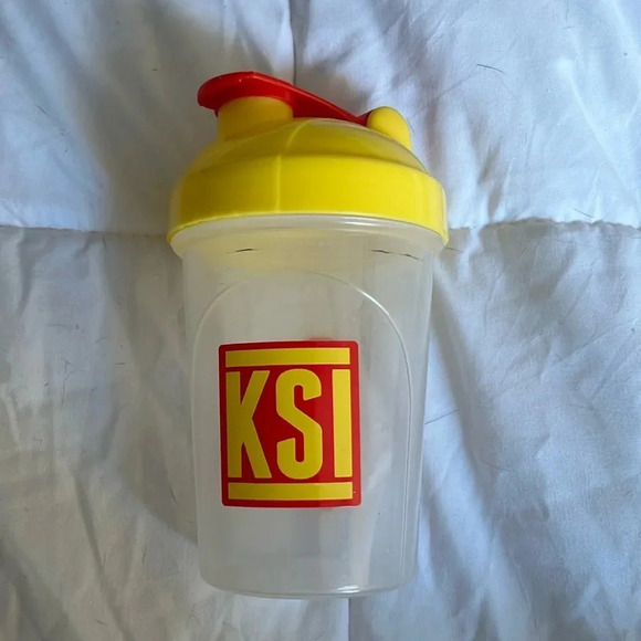 This is a G fuel energy shaker drink. It is plastic, yellow, and red.
