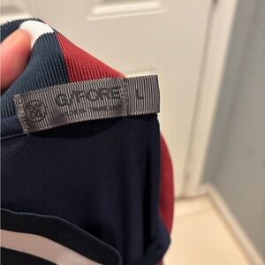 The G/Fore Contrast Collar Polo Dress is a stylish and practical option for women's golf wear. Made from knit fabric with a stretch feature, this dress offers comfort and flexibility during movement on the golf course. The navy blue color and contrast collar add a touch of sporty sophistication to the overall design, perfect for a preppy golf look. With a button closure, short sleeves, and a dress length, this polo dress is ideal for summer, fall, and spring seasons, making it a versatile addition to any golfer's wardrobe. Worn once . Like new condition.