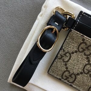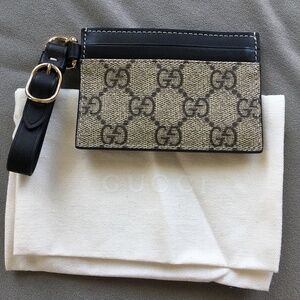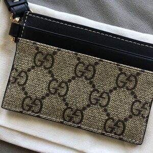 The GG Emblem collection reinterprets signature motifs through creativity and innovative functions , and is envisioned to be cherished for years to come. Introduced in the latest line of small accessories, this beige and dark brown card case is crafted from the new GG Monogram fabric. Featuring multiple compartments, it is completed by a contrasting black leather wrist strap.