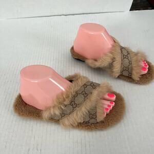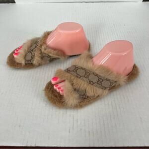 GG Fuzzy Furry Criss Cross Light Brown And Beige Slip on Flat Slippers Sz 39