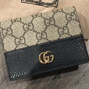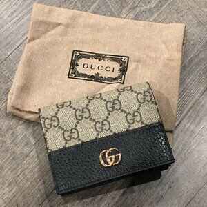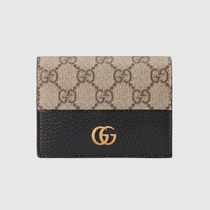 Encase your essentials in Gucci history with this beige and black Marmont wallet. Made in Italy from a combination of GG Supreme canvas and grained leather, it plays host to 4 card slots, a zipped coin pouch, and a note compartment.