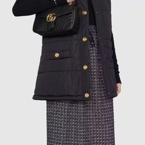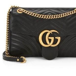 The small GG Marmont camera bag has a softly structured shape and a flap closure with Double G hardware. The sliding chain strap can be worn multiple ways, changing between a shoulder and a top handle bag. Made in matelassé chevron leather with a heart on the back.