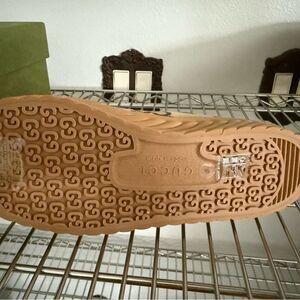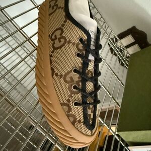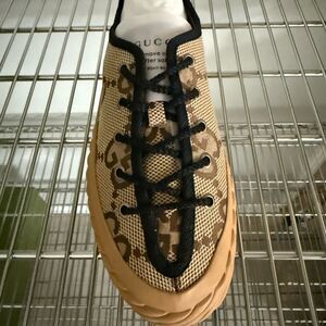 Stylish sneakers featuring a GG monogram design. Black laces add a sleek touch. Perfect for casual wear. Size 9.5 women’s brand new. With box and dustbag