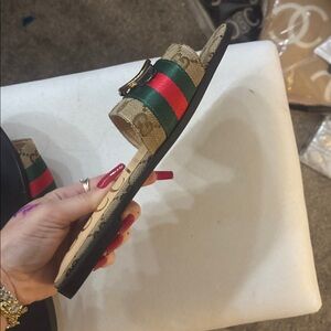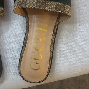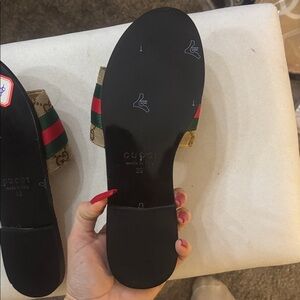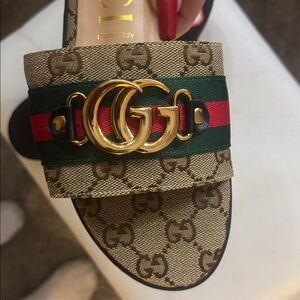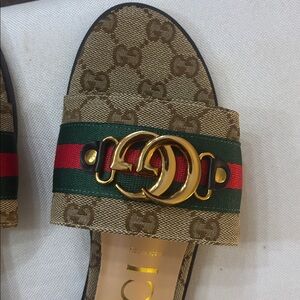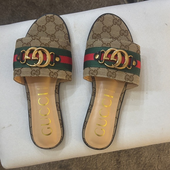 I have a brand new pair of Gucci slides sandals they have the Gucci logo on them along with their red and green stripe with the big Gucci metal logo in the middle size 39, which is a size 8 in the US