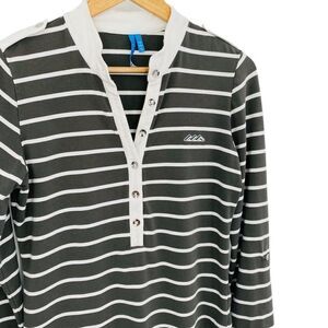 GG Blue gray green striped henley style top with button tab sleeves size small. Excellent condition perfect for golf or tennis. Soft modal blend. See photos for measurements and fabric content
