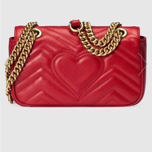 The small GG Marmont flap bag has a softly structured shape and an flap closure with Double G hardware. The sliding chain strap can be worn multiple ways, changing between a shoulder and a top handle bag. Made in matelassé chevron leather with a heart on the back.