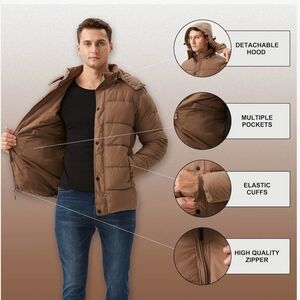 GGleaf Men's Hooded Winter Coat Warm Puffer Jacket. Removable Hood. Khaki. Size XL. New.