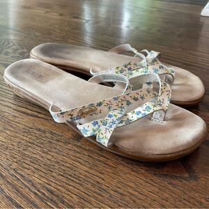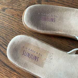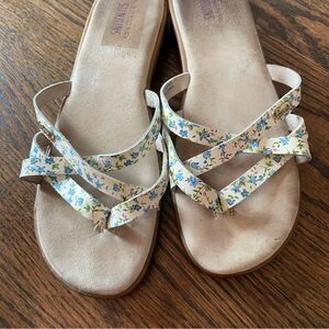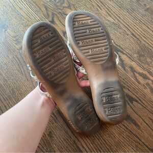 These G.H. Bass sandals are in good used condition. Sharon style in white floral print leather. Cushioned insole and comfortable straps. Size 9.