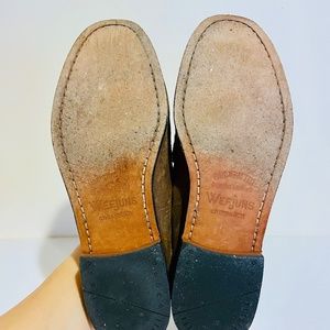 G.H. Bass Brown Leather & Camo Weejuns Penny Loafers Men's 8.5 D Shoes. Pre-owned, used condition. Purchased around 10 years ago - worn but mostly kept stored in its box. General wear throughout - scuffing on leather uppers and wear to outsoles - please review all photos. Uppers are leather with camouflage print canvas fabric. Outsoles are leather with rubber heels. Size listed is 8.5 D and bottom outsole measures approximately 11 inches long. Made in El Salvador. Comes with box as pictured.