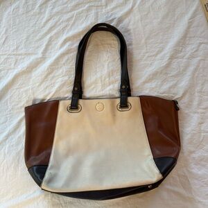 Chic tote with cream and brown panels. Features sturdy handles and front zipper pocket. Ideal for daily use.