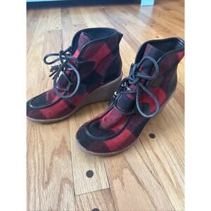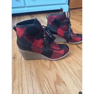 G.H. Bass & Co. Size 7.5 TERESA Black Red Plaid Flannel Leather Wedge Boots