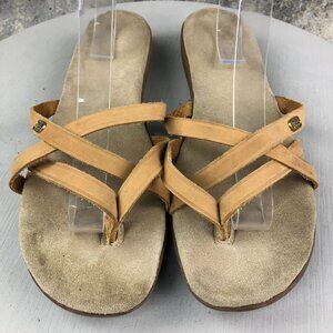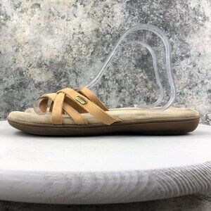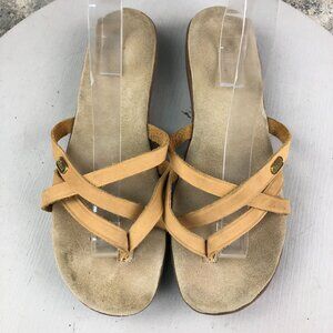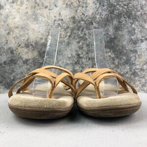 Women's vintage Sunjuns The Sharon tan genuine leather slip on sandals, flats. Open toe, thong toe post, slip on styling, strappy. Wide (W) width.