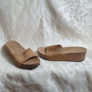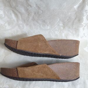 Boho or classic these shoes will go with ANYTHING. When you don't know what shoes to wear grab these. Suede strap with cork bottom. Rubber non slip sole. Couple wrinkles on inner sole but lightly worn.