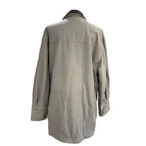 This jacket features a contrasting faux-nubuck collar, two large button-flap pockets, dual side-entry hand pockets, button front closure with hidden placket, and an extended length for added coverage. Perfect for hiking, travel, and everyday transitional weather.