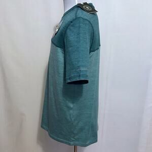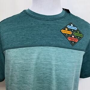 NWT. Green Performance Shirt for Men Size M. Block colors as per tag it is known as "Aqua Splash Htr" - marled dark green top and marled light green bottom, short sleeves, crewneck, graphic brand logo left sleeve, as per tag "cooling fabric, stretch, wicking, sunblocker UPF 50". Pictures are part of description.