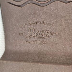 Branding details: Small Bass fabric tab at heel, G.H. Bass & Co. insole logo, Bass-branded rubber outsoles marked Maine USA.