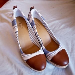 Like new G.H. Bass & Co. "Kaitlyn" style nautical boat shoe wedge with hemp rope braided wedge heels, brown leather toes and backsides, a blue and white stripe canvas body and leather soles. Insoles and soles are both in perfect condition (photo 5&6), and there are no scuffs or markings anywhere on the shoes.