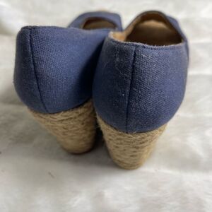 G.H Bass & Co Navy Blue denim wedge espadrilles slip on peep toe SZ 9.5M pre owned in good used condition normal wear see all pictures any questions please message.