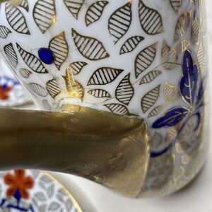 Includes five tea cups, six saucers, six dinner plates coffeepot, creamer, pitcher and butter dish. Each with blue, red and gilt decoration. All in excellent condition except pitcher has been broken and repaired please see photos.