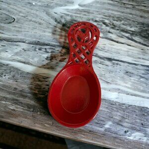 Add rustic farmhouse charm to your kitchen with this vintage red cast iron rooster spoon rest. Featuring a bold enamel finish with a lattice detail and rooster motif, this sturdy piece doubles as both functional cookware and charming décor. Perfect for keeping counters clean while cooking or as a wall-mounted accent in a farmhouse, cottage, or country-style kitchen.