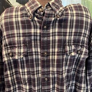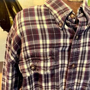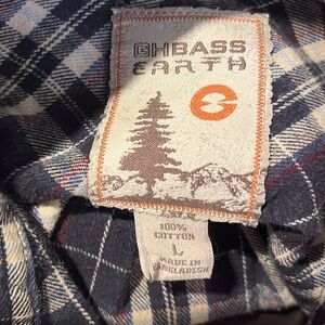 GH Bass Earth warm flannel button down shirt sz L in colors Grey, black, cream , red & blue plaid in very good gently pre owned condition! 100% cotton! Comfort and quality! Casual, vintage, classic, comfortable, great for Fall or Winter seasons.