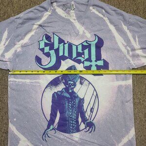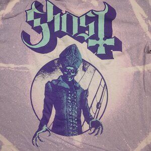 Stand out in this GHOST band T-shirt featuring a bold logo graphic and unique purple splatter dye design. Perfect for concerts, festivals, or everyday rock style.