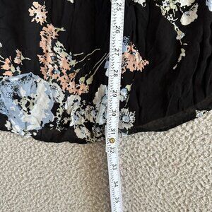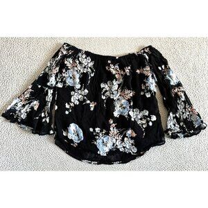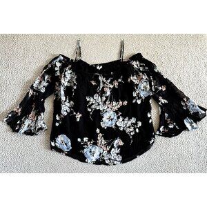 GHOST London Floral Blouse sz Large Trumpet Sleeve Flowy Boat Neck Spaghetti Off Shoulder