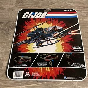 GI JOE flying chopper with hand, held launcher flies over 20 feet includes one chopper and one launcher ages six and up new in package just snap the wings on top of the chopper place and twist. The chopper on the launcher pull back the string and release for the chopper to fly
