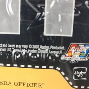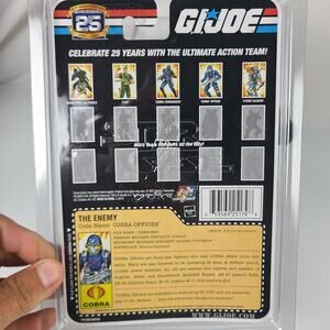 The product is a GI Joe 25th Anniversary Foil Cobra Officer action figure by Hasbro, released in 2007. This figure comes with an assault rifle and is part of the G.I. Joe franchise. Standing at 3.75 inches tall, this plastic toy represents the Cobra Officer character from the ARAH movie and TV show. It is part of the 1:18 scale and features a figure stand for display. This collectible item is an original licensed reproduction from Hasbro, perfect for fans of cartoon and TV characters.